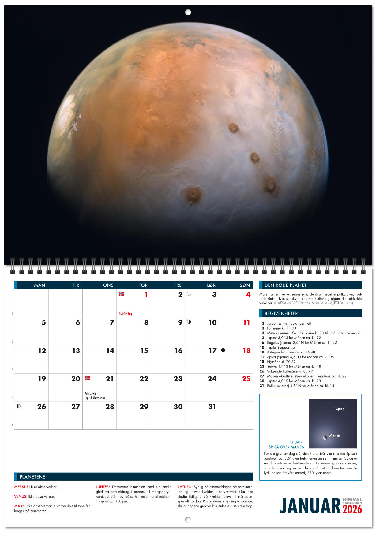 Alle har bruk for en Ă„rskalender. Himmelkalenderens veggkalender mĂ„ler 30Ă42 cm nĂ„r den er oppslĂ„tt. Den er trykt pĂ„ tykt papir av hĂžy kvalitet. Alle sider er i farger. I tillegg benyttes skikkelig ringinnbinding, noe som sikrer at arkene blir hengende helt inntil veggen. PĂ„ baksiden finnes forklaring av ulike astronomiske begreper.
