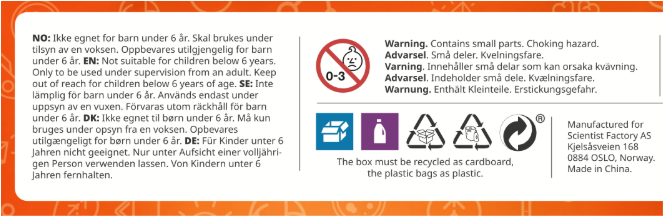 Advarsel. Ikke egnet for barn under 6 Ă„r. Skal brukes under tilsyn av en voksen. Oppbevares utilgjengelig for barn under 6 Ă„r. SmĂ„ deler. Kvelningsfare. Â