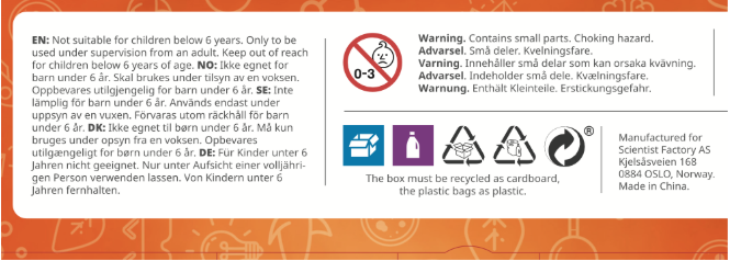 Advarsel: Ikke egnet for barn under 6 år. Skal brukes under tilsyn av en voksen. Oppbevares utilgjengelig for barn under 6 år. Små deler. Kvelningsfare.